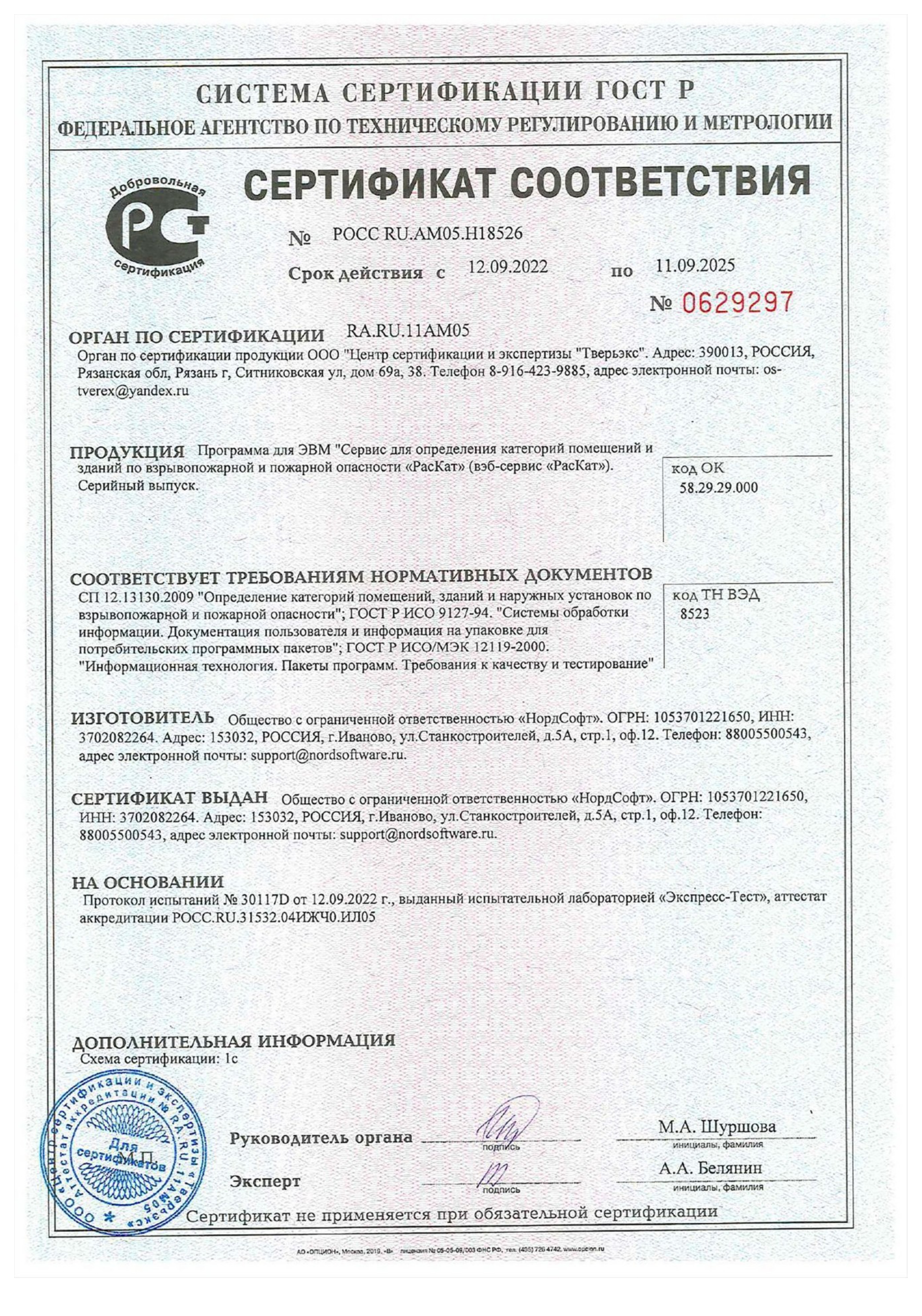 Проведение расчетов категорий осуществляется нашими специалистами с применением сертифицированного программного обеспечения, что максимально исключает допущение ошибок и гарантирует объективный результат. Итог работы оформляется в виде сброшюрованного технического заключения в 2-х экземплярах.